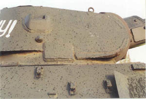 A close-up of the real welded turret from the Aberdeen T-34 m1941 shows the prominent weld seams around the side periscope and front plate. Here we see the correct position of the side viewport that UM appears to have molded in an erroneous location. The German tool clasps on the hull side are for handtools not present on this particular Beute T-34 and not included within the UM kit. Dragon’s kits #7268 and #7316 do include the German hand tools that can be borrowed for the UM model. The two Sprue-A included contain the wheels and the hard styrene link & length tracks and are the same as in UM’s kit 336. Please see my review of kit 336 for comments and a photo of this sprue.