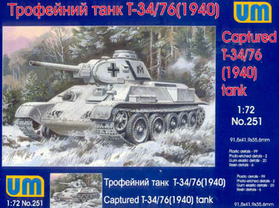 This in-the-box review is complimentary to my review of the 1/72 scale UM kit 336, the model 1940 T-34 with short 76 mm L-11 main gun which shares most of the same kit sprues and etched brass parts. Take a look at the review of kit 336 to read about the other sprues. Many of the comments on kit 336 will also count for this kit. Though labeled by UM as a model 1940 T-34/76, by all my references this is referred to as a model year 1941 (m1941) based on the longer F-34 tank gun and the bolted mantlet. I understand that both this model and the m1940 T-34 were built in the same time period with eventual preference for the longer gun causing the production of the shorter L-11 gun to cease in late 1941. German references would call this a T-34 B. Based on the number of photos I have seen, perhaps hundreds of T-34 tanks were captured and taken into service by the Germans and other Axis forces on the Eastern Front. They were even found within Axis units in France, Italy and the Balkans. Some got major modifications like this UM kit, others were just painted with oversize German crosses and used till destroyed or till they broke down. UM’s very nice box art shows the vehicle the model is based upon, a captured (Beute) T-34 m1941 with modifications made by German repair shops. We see a welded turret, which is different from the cast turret included in UM’s kit 336. The gun and mantlet are common to the model 1941 through model 1943, while the driver’s hatch, towing points, bolts across the point of the bow, DT machine gun mount and flat tracks are shared with the model 1940. The German modifications that are evident here and in the scan below are two storage boxes on the rear of the port and starboard sides, the Notek light on the port side and a Pz III/IV commander’s cupola on the turret roof. The UM model consists of about 100 crisply molded, dark green styrene parts, three etched brass parts, 20 soft plastic tires for the roadwheels, and six cast-resin parts particular to this model kit. Forty four of the styrene parts are the hard link & length track parts. Here is a former German Beute T-34 m1941 captured by Allied forces in France and now residing at Aberdeen Proving Grounds in Maryland, USA and basically the same vehicle as within this UM kit. From this view we can see the welded turret and m1941 F-34 gun and mantlet but without cupola. We see the German storage box on the rear quarter of the upper hull just like in UM’s kit and the opening in the hull for the radio antenna over the forward roadwheel. At the rear of the hull, far left, we see the spare-track storage. Lower down is the rubber-tired idler wheel at the front (right), and the five dish-shaped rubber-tired roadwheels. Above the 2nd and 3rd roadwheels on the hull side are German tool clasps. The track is the early stamped track with little tread pattern, while UM gives us a track common to 1942 and 1943.
