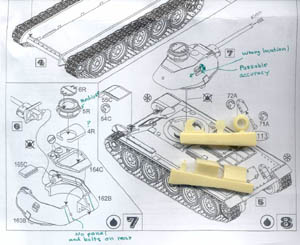 This photo shows the assembly instructions of UM’s captured T-34 turret and the resin parts, and with the six amber-colored cast resin parts just right of center. The resin parts consist of the two hull storage boxes, three turret hatch & cupola parts and a Notek light. The Panzer III cupola is adequate but not as accurately portrayed as that offered by Dragon in their Beute T-34 kits.