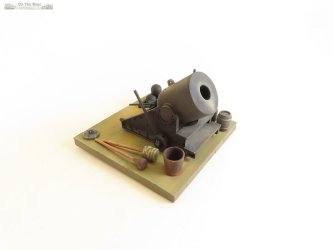 the trunnions and strips of scrap brass restored the straps. A layer of Tamiya surfacer roughed up the barrel. Any small chips and