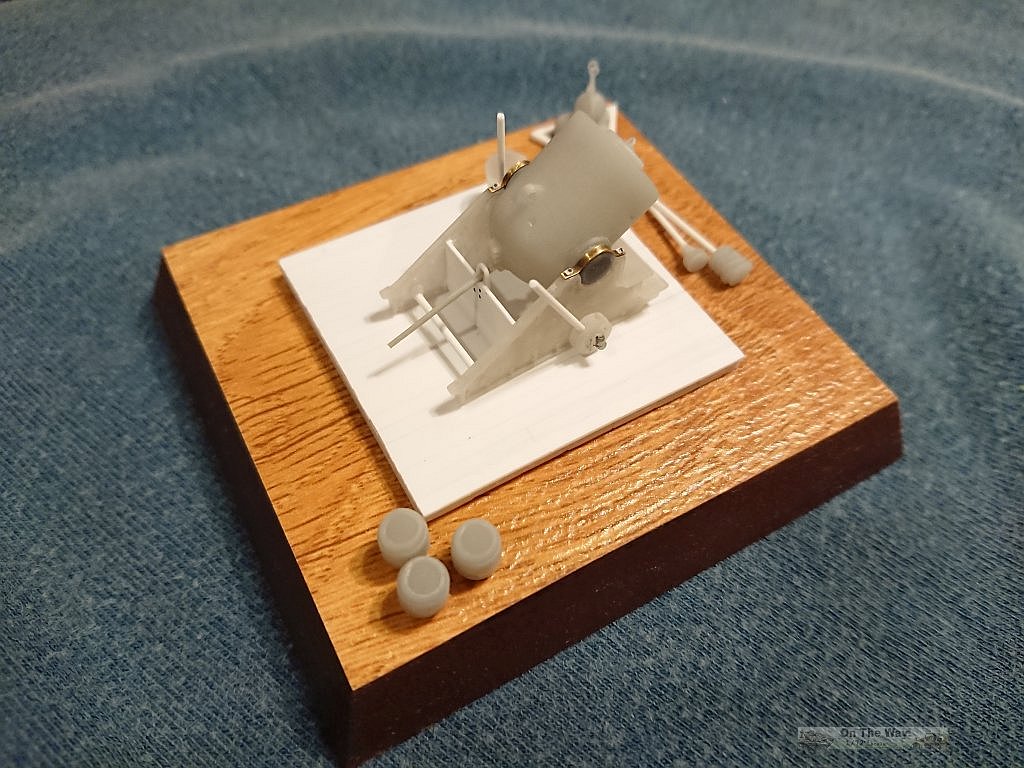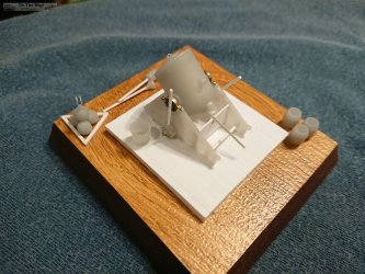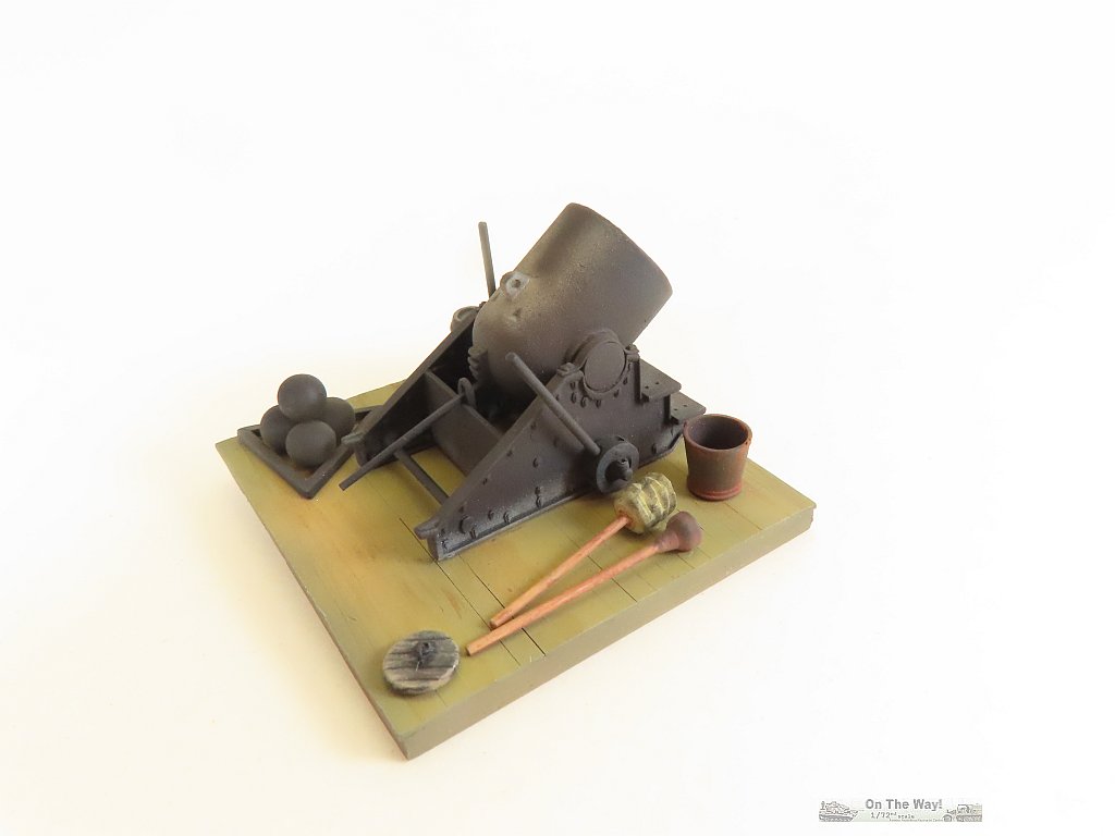 With the trucks tossed I decided to construct a small base to mount the gun, built from plastic strip and square rod. I also added a scratch built triangular cannon ball rack. If you look closely at