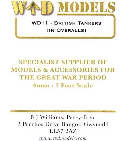This figure set comes in a small plastic bag with a paper insert. Basic instructions are printed on the reverse of the paper and only consist of a warning to be careful cleaning up the castings to avoid damage and to de-grease the figures before priming. Also there is declaration that the parts have been cast in some sort of alloy metal with no lead content. A small colouring guide would have been nice for those, like myself, that have little or no references or knowledge of World War One uniforms anbd their colours. Paint manufacturer recomendations would also be helpful. Parts exhibit next to no flash and just a hint of a seam. Clean up effort should be minimal. You get 5 bodies in various poses. Arms and heads come separate. There are 3 arms, two of which appear to be identical. Heads come with helmets (5) or hats (5). For the helmets there are two with the chin strap across the brim of the helmet and the other three having the strap run under the chin. With 5 bodies and 10 head versions the modeller has quite a few options when mixing and matching the body parts. Scale is listed at 4mm to the foot, which works out to 1/76 scale. I measured the parts to see how tall a completed body would stand. Using my trusty dial calipers I measured the longest bodies, which came to 0.80in, and each of the heads, which were about equal at near 0.19in. When added together this comes out to 0.99in which is just a tad under 6ft tall in 1/72 scale. When one considers that the average height of a US soldier in World War Two was 5ft 8in (I found this on aweb site someplace), and I would suspect that World War One soldiers would be not too different, making these Brits toward the tall side for service men and should be more than acceptable for most applications. Preview sample provided by Barry Williams of W^D Models. |