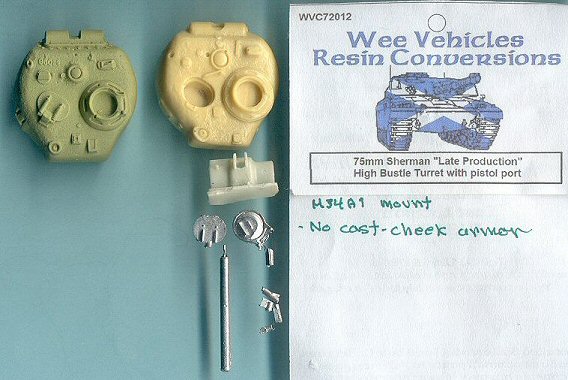 This resin aftermarket Sherman turret represents a late production "high bustle" Sherman with the 75-mm M3 medium velocity gun, all-round vision cupola and oval loader's hatch as the main defining features. By "high bustle" we mean that the bustle at the rear of the turret for holding the radio was raised to make clearance for the larger driver hatches on the large-hatch Sherman hulls. The parts come in a small plastic bag with no boxart or assembly directions. This turret would be at home on the M4A2(75) and M4A3(75) with the 47 degree glacis big-hatch hulls, the big -hatch M4A1(75), the big-hatch M4(75) Composite (Hybrid), and the M4A6(75). Below is a scan of the Wee Vehicles parts at right next to a LEVA Productions late production 75-mm turret with similar features for comparison. My review