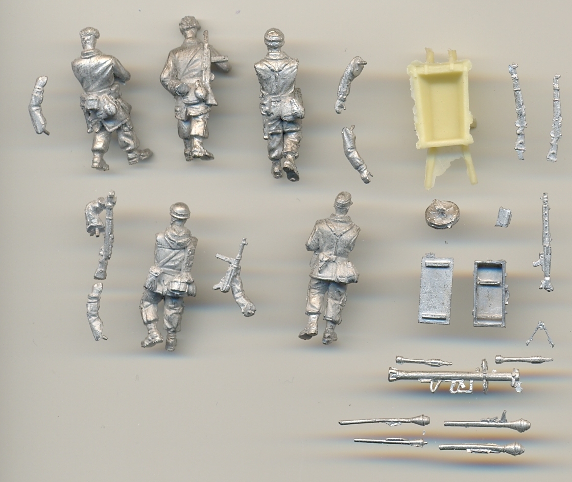 need a fair amount of cleanup. Doing the math, that would mean that this demi-squad is quite well armed. That said, I don't think all the spare weapons would ever fit in that tiny wheelbarrow. These five figures make for an almost instant vignette representing retreating troops. Add a burnt out AFV on the side of the road and you're done ! |