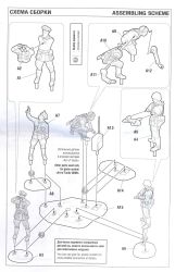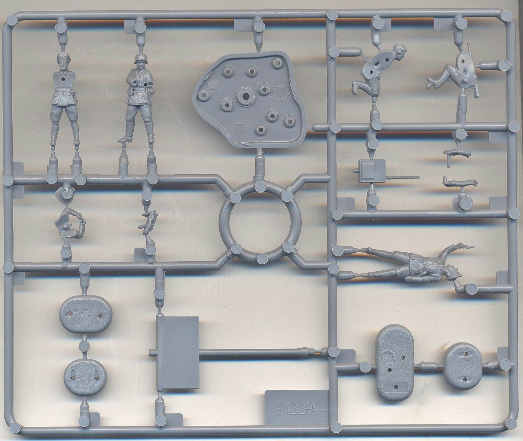 While primarily aimed at the wargaming community (witnessed by the base with oversized banner, the wargaming stats on the back of the box and on the playing card inside), this typical 4-figure Zvezda set is a very welcome addition to the figure collection of a static modeler, as they carry a high diorama potential. As usual, the front and back of the box leave little to the imagination. Inside the small end opening box is a single sprue of fairly hard grey plastic. This contains the parts to assemble four figures. A large part of this sprue is taken up by a banner and four base plates, which the display modeler will probably not use (except during painting). For those who are interested, the bases offer the option of grouping the four figures together or giving each figure its own base. The four