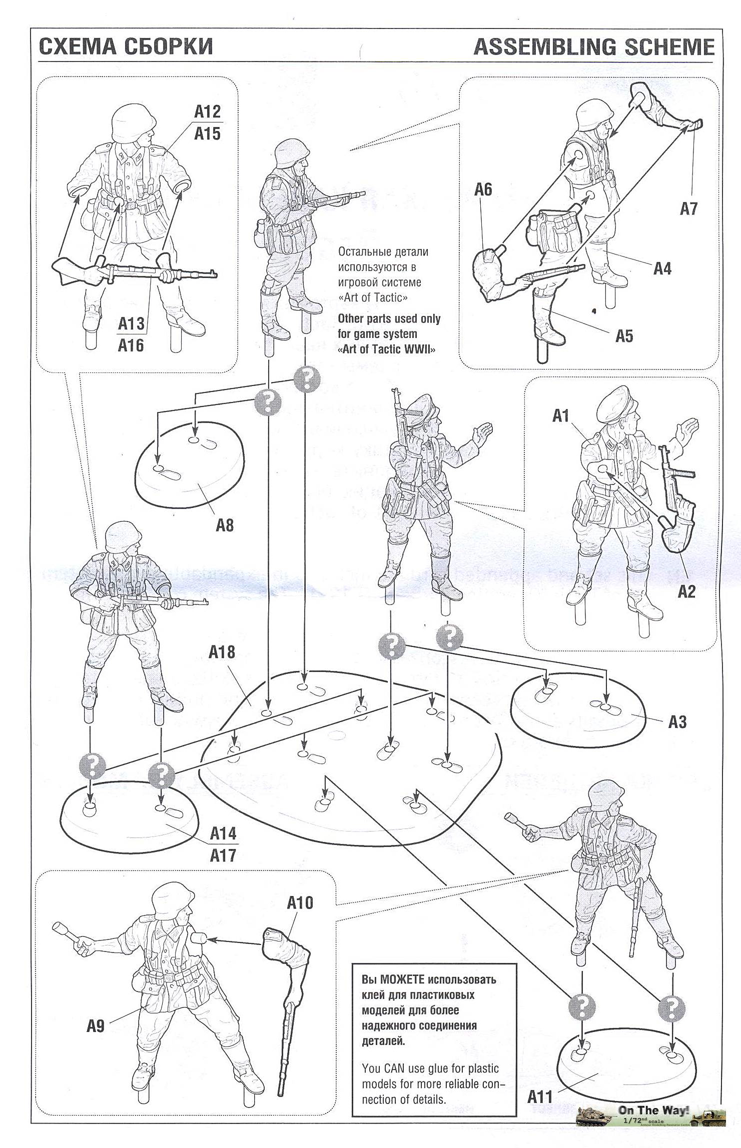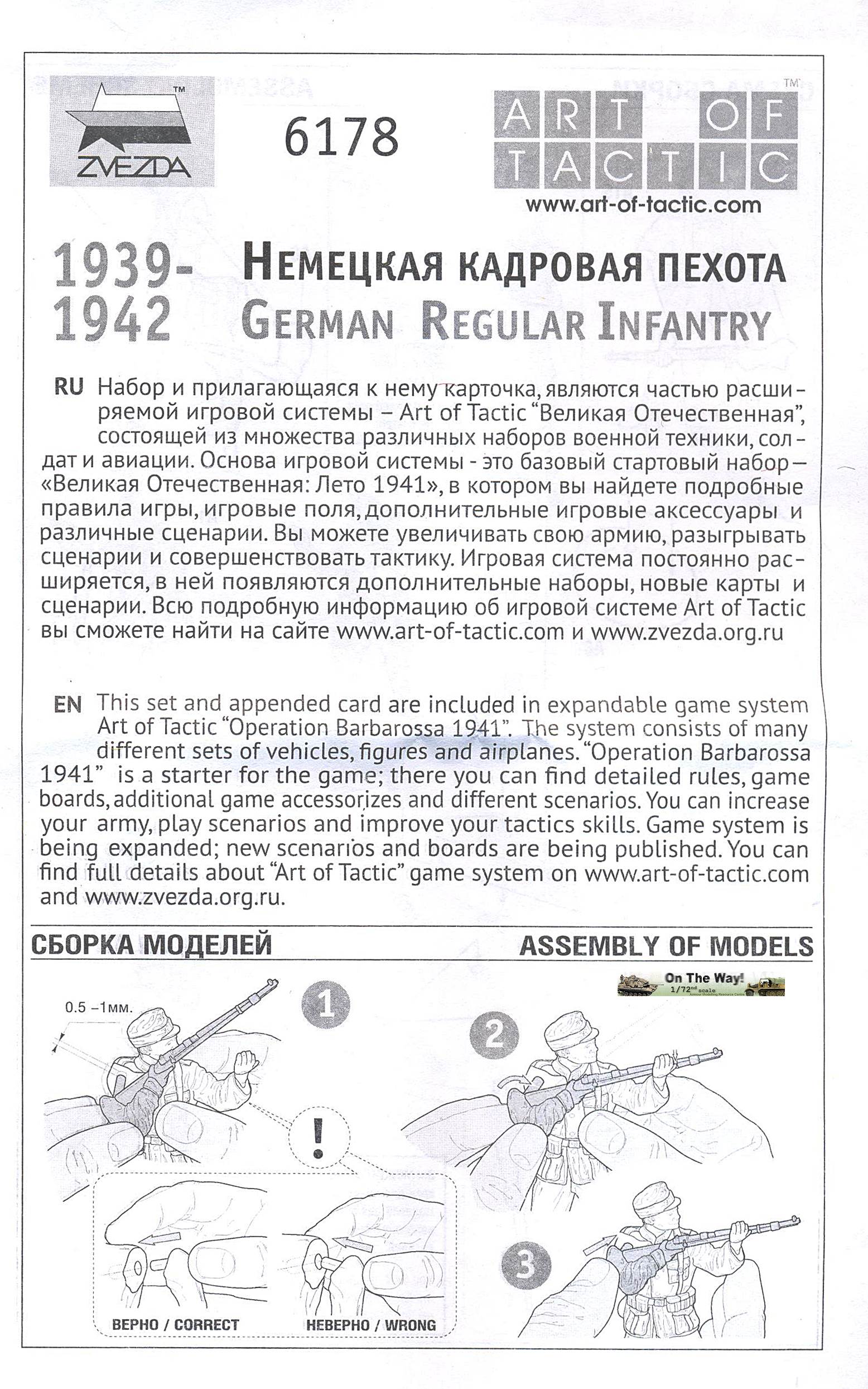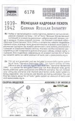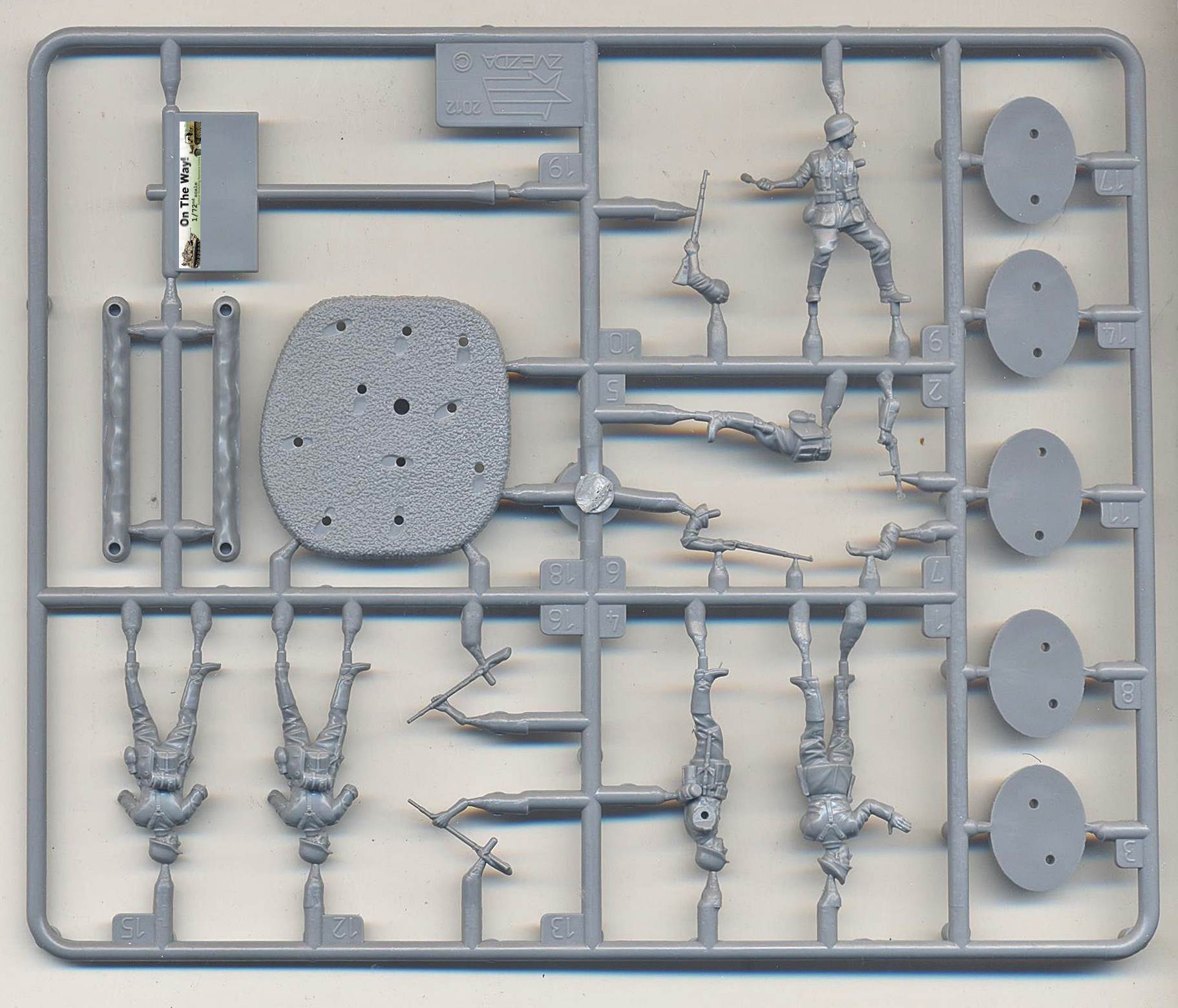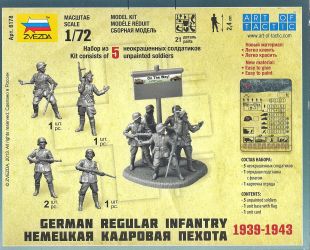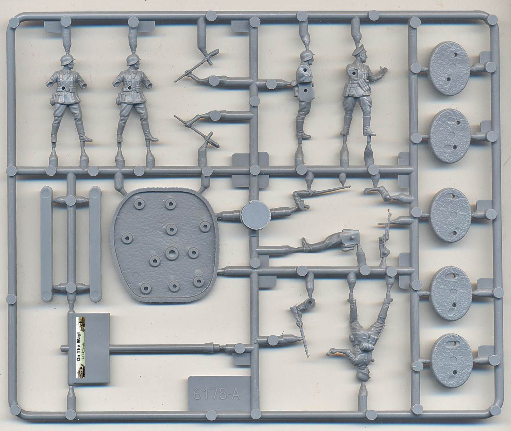 German infantry sets have been produced by the thousands by uncountable manufacturers but this one is slightly different as it has a distinct summer feeling to it. In this box you get a single sprue carrying 5 figures, in 4 different poses. As this sprue contains a base to support all five figures or five individual bases (always handy when painting), a wargaming flag and two unidentified "ridges", it is obvious that the useful amount of plastic is only a small percentage of the total. The box leaves nothing to the imagination as both the drawing at the front and the pictures at the back clearly show what to expect. Together with the instructions there will be little doubt about the way these figures assemble. Diorama potential is obvious even before opening the box. The boxtop