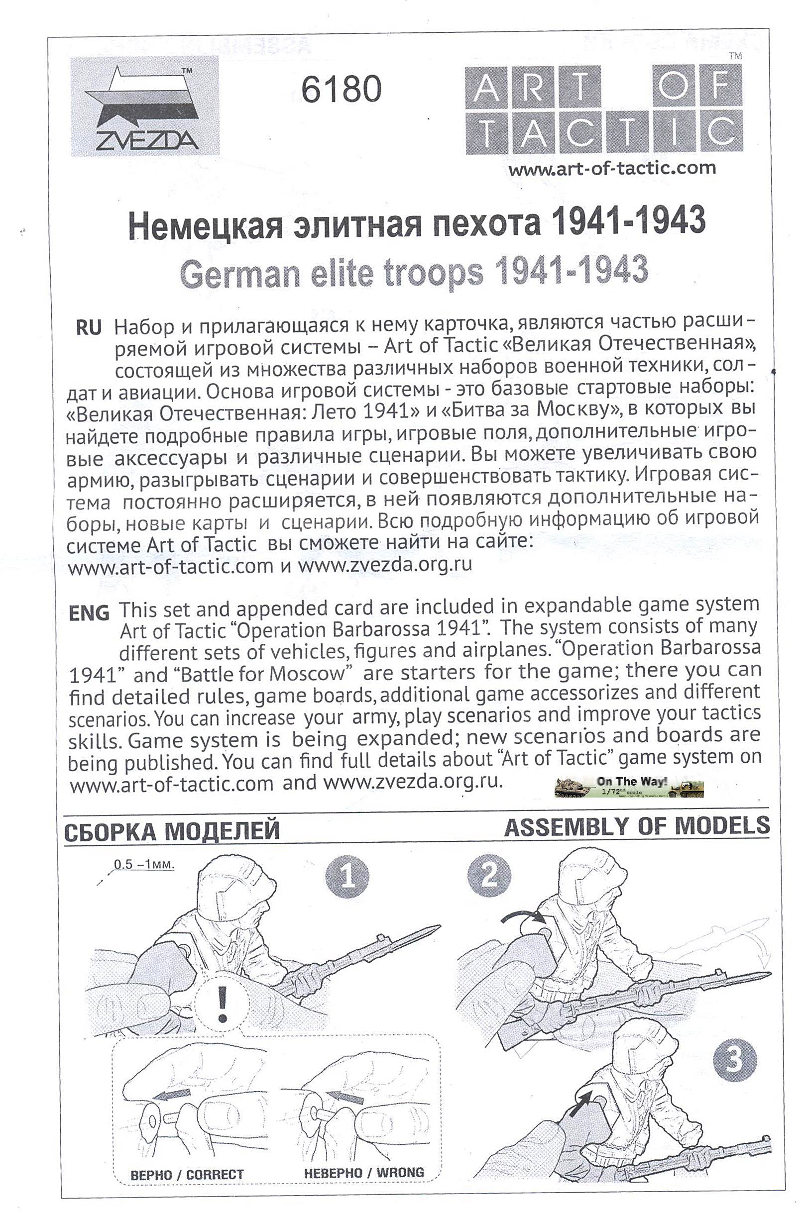 underneath. The figures have convincing poses, but are somewhat incongruous, as already mentioned. All are travelling with limited gear and are not even wearing the gas mask canister. The figures appear to wear the taller boots, which are an indication of an early war setting again. Three of the figures are armed with the standard Kar98k rifle, of which two are running (with bayonet fixed to the rifle); one is firing while crouching; one is cautiously observing, holding (what seems to be) an MP28/2, which is a very rare piece of equipment (even more so in 1/72) and would not be used long after the start of Barbarossa. The last one is observing the surroundings with his binoculars, pistol at hand. He is most likely a senior NCO, based on the battered-looking Schirmmütze that he is wearing. Obviously, these sets are aimed at the wargaming community (with a stats card -not shown-, flag and base) and while this might drive up the cost due to extra parts not needed for static modeling, it also reduces the cost due to a larger sales potential. Besides, I actually like the bases as they are very practical for handling the figures during painting, while the flag is a good source for thick plastic when scratchbuilding. Casting and detail is really good, except at the level where the two mold halves meet. In this area some resculpting will be necessary. The joints between the parts will also need a bit of attention, but as the plastic react well to MEK, they can easily be smoothed out. As far