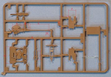 The small box contains 4 dark tan sprues with a total of 57 parts. Of those, 39 go into the gun, 16 make up the crew of 4,