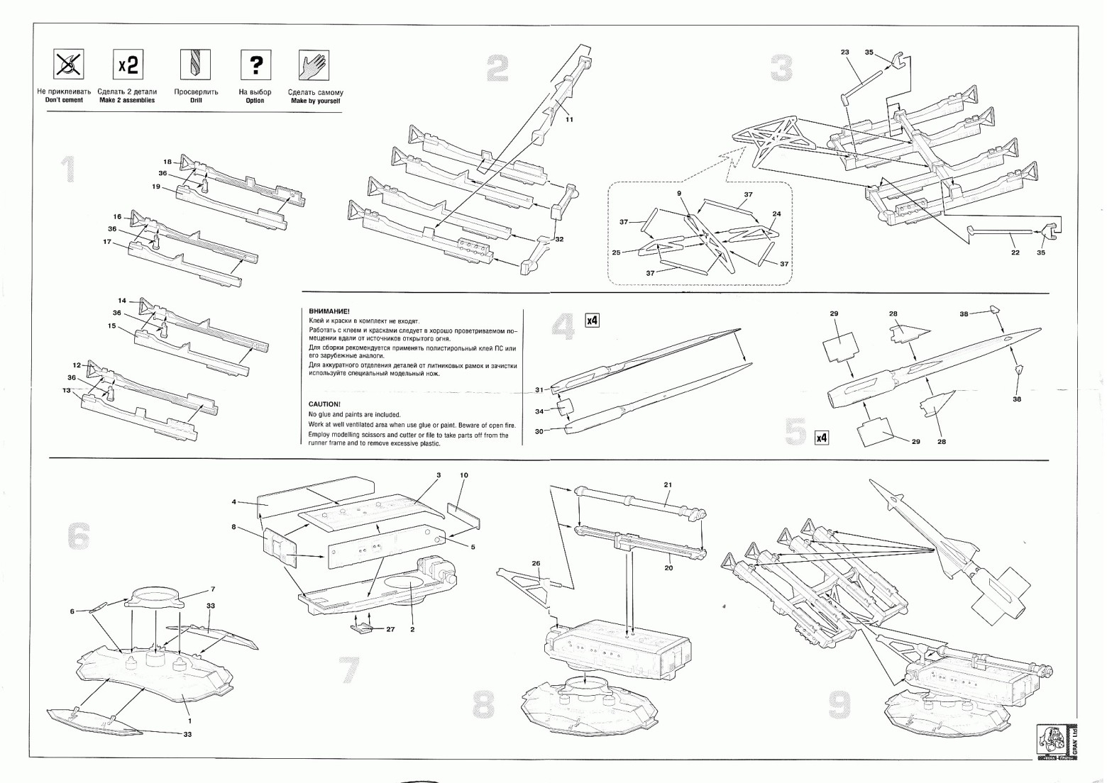 Contents consist of three sprues. There are two sprues, each with 25 translucent pieces molded in a fairly brittle plastic, and one sprue of 27 pieces molded in soft white plastic - giving a total of 77 parts altogether. A decal sheet is included and is printed by Begemot. They are glossy and well printed but the carrier film has a definite yellow tint to it similar to the yellowing you see on decal sheets that are decades old. Why are they so yellow, yet so tender in age? My guess is that the paper they were printed on has so much acid content that it is staining the carrier film. Hopefully it's not the result of Begemot being lazy and using inferior materials. As for the plastic parts, the disparity in quality between the sprue in white plastic versus the two translucent sprues leads me to believe they must be from two different sources. The two sprues of translucent parts (sprue on the right of the parts diagram below) are reasonably well molded, with little flash, though there are some fine striations on some parts such as the booster fins (parts 29, 30 & 31). The white sprue (on the left side of the parts diagram below) reminds me of what typically produced by Amodel. All the parts have prominent mold lines, plus quite a few pockmarks, striations and various bumps, lumps and nicks. Construction was broken down into 6 sub-assemblies: one each for the four rockets, one for the launcher and one for the launcher base. The missiles were the easiest part of the build. As mentioned above the parts fit quite well. The tops of the booster sections are see-through, so I cut out four plastic discs from some sheet to fill the openings. I also put a plastic tube in the rear of each sustainer portion to give some depth, though you can see next to nothing here once the body halves are joined Half of the fins are molded directly to the body halves, while the others come as separate pieces that have tabs that fit into slots in the body parts. The fins fit reasonably well except for the front most, which were a tad too small and had a penchant of pushing right through the slot. I decided to add all the separate fins to the body pieces first before joining the missile bodies together. Doing this would avoid problems trying to fit them into their corresponding slots afterwards. I must point out that the fins (part 28) are excellent. Instead of taking the easy way out and mold them totally flat, Gran has molded them with the angled/faceted leading and trailing edges. The biggest issue with building the missiles was with the translucent plastic. Because light could shine right through the parts, it was virtually impossible to tell what effect filling, sanding and scraping had during construction. It was most difficult to tell if seams were filled properly or sanded smooth enough. I did the best I could and decided to wait until the primer coat revealed flaws that needed fixing. The launcher and base were another problem altogether. Because they were on the soft white sprue, all the parts had to be extensively prepared before being joined together. Every part required scraping and sanding to remove the mold seams, flash, pits, bumps, scrapes, striations - you name it. These parts were atrocious. As a result of all the sanding and scraping to remove seams, anything that was supposed to be round became flattened. Most pieces were left as is, such as the brace for the launch rails (parts 9, 22, 23, 24 & 25). It would have been too much work to fashion replacements out of plastic rod and they are mostly hidden in their location underneath the launch rails anyway. I did replace the shaft for the hydraulic cylinder (parts 20 & 26) with some round Evergreen plastic rod. These parts were too exposed to not do this. The instructions are a tad vague on where some parts are to be located. Take your time here. Refer to as many pictures as you can on the web and from the instructions and you should get everything in its proper place. Part 27 is to be placed on the underside of the launcher but the instructions do not show the exact spot, just having an arrow pointing in the vicinity of the rear portion on the underside of the launcher. I just placed it in what appeared to be a good location and just accepted the fact that nobody I'll ever meet is going to know exactly where it goes anyway. After slogging my way through the entire cleanup over the course of a couple of weeks, and gluing everything together, I was ready to prime and paint. The first coat of primer exposed many flaws in the launcher and base, which required fixing. My decision to wait until the primer step to finish the missiles proved problematic. Though the paint exposed only a few flaws, removing them was a nuisance. Any sanding and scraping removed some of the paint so that the translucent nature of the plastic acted like a dark cave, leaving black spots that made it even more difficult to determine if I was actually accomplishing anything with my work. All I could do was prime, sand and scrape many times over until I was reasonably confident that things were acceptably smooth for the final coat of paint. Now came the actual finishing. There was no way I was going to use those yellowed decals. The suggested scheme for the missiles was primarily white, and I wasn't about to put yellow decals on a white model. I did think of bleaching the yellow out of the decals by exposing them to bright sunlight for a few weeks, but I wasn't comfortable that they would not yellow again over time after they had been on the model for a while. Paranoid - sure! But better safe than sorry!! So I consulted the "great electronic modelling library", aka the internet, to see if I could find camouflaged examples. As luck would have it, I found one picture that showed an overall dark grey missile. This was all I needed, and I proceeded to paint the missiles a dark grey (Aeromaster RLM 74) with wide red warning stripes (Floquil Caboose Red) on the nose. I also wanted the launch