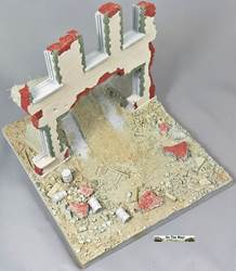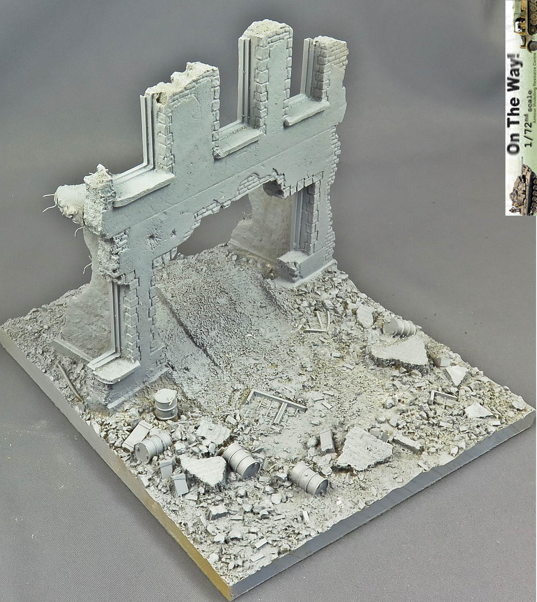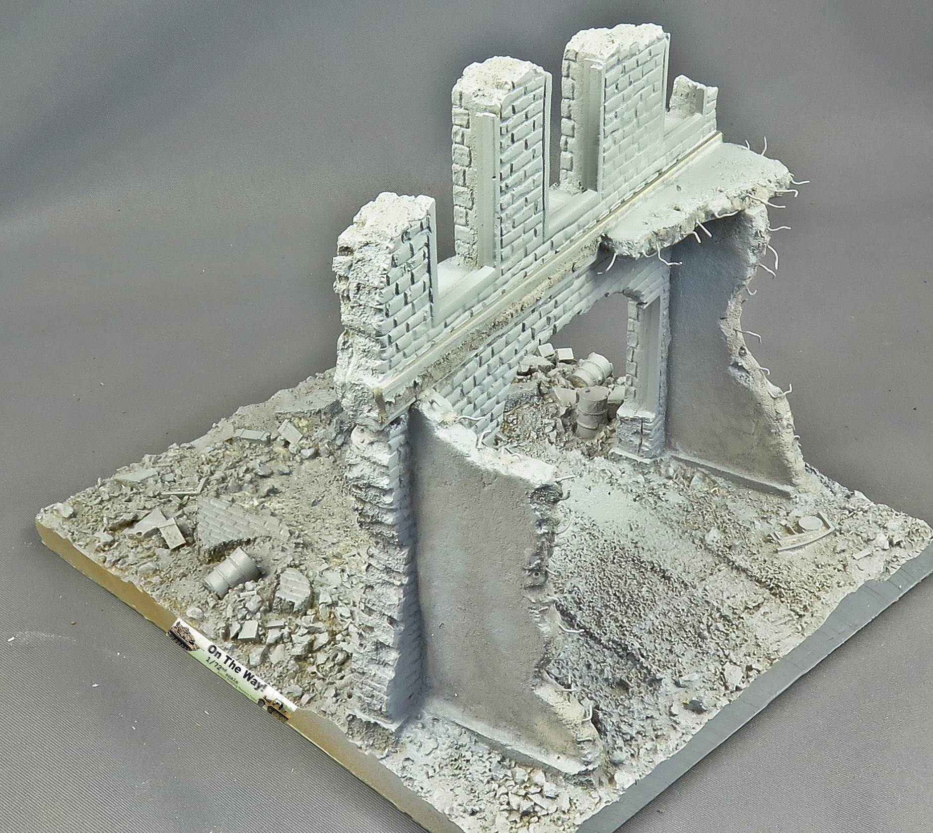 Assembly was straightforward, but as already anticipated, adding detail to the rear of the parts took a huge amount of time. In my opinion it is absolutely necessary, however, as both sides of the parts are visible. As you can see in the pictures below, on some parts the bricks and window frames were engraved, while other parts were roughened up with super glue and baking powder. Rebars made from copper wire were added as well. In the pictures below a very basic paintjob was applied, which clearly still needs a lot of work. A lot of extra rubble will be needed as well.